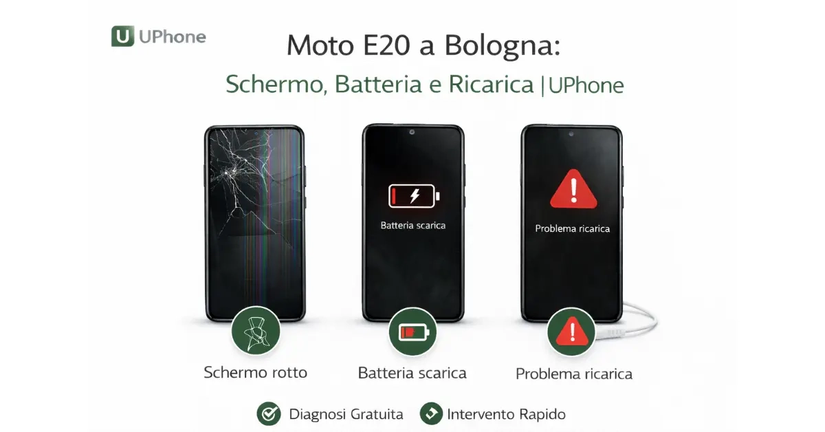 Se il tuo Moto E20 ha problemi di schermo, batteria, ricarica, microfono o fotocamera, nel laboratorio Riparazione Cellulare Bologna UPhone trovi diagnosi gratuita, tempi rapidi e assistenza chiara prima di ogni intervento.